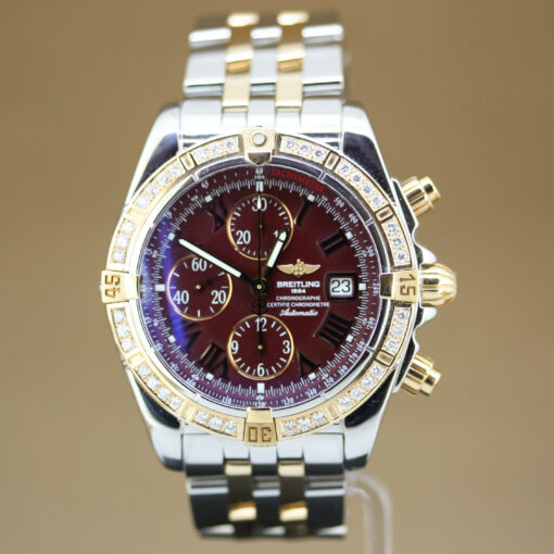 Eine außergewöhnlich exklusive Breitling Chronomat Evolution mit seltenem burgunderrotem Zifferblatt und Diamantlünette aus Roségold – ein echter Hingucker für den anspruchsvollen Uhrenliebhaber.